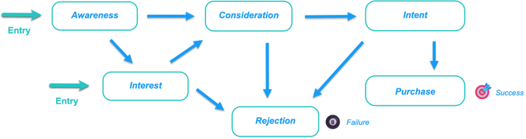 Defina os estágios em um único modelo de preparo, definindo vários estágios e o fluxo de transição entre eles. Um ou mais estágios são designados para entrada no ciclo de vida. O modelo também permite a progressão não linear, onde você pode especificar transições de um estágio para outro, como do estágio A para os estágios B, C ou D. É necessário que um estágio seja designado como o estágio de sucesso, como uma compra ou contrato assinado. É opcional que outro estágio seja designado como um estágio de falha, como um contrato rejeitado ou a compra de uma solução concorrente de outro fornecedor. Monitore esses estágios por meio de painéis inteligentes que mostram como os grupos de compras estão progredindo em termos de conclusão de uma oportunidade de venda ou de conversão de uma oportunidade em um cliente.