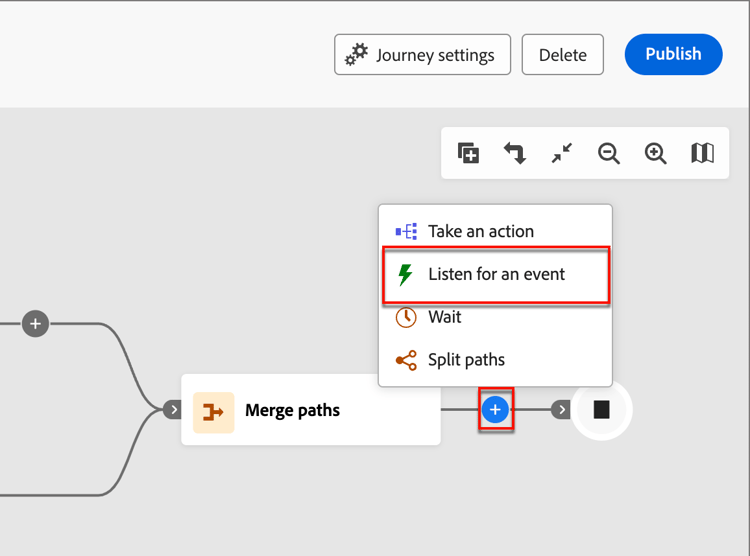 Clique no ícone de adição ( + ) em um caminho e escolha Ouvir um evento.