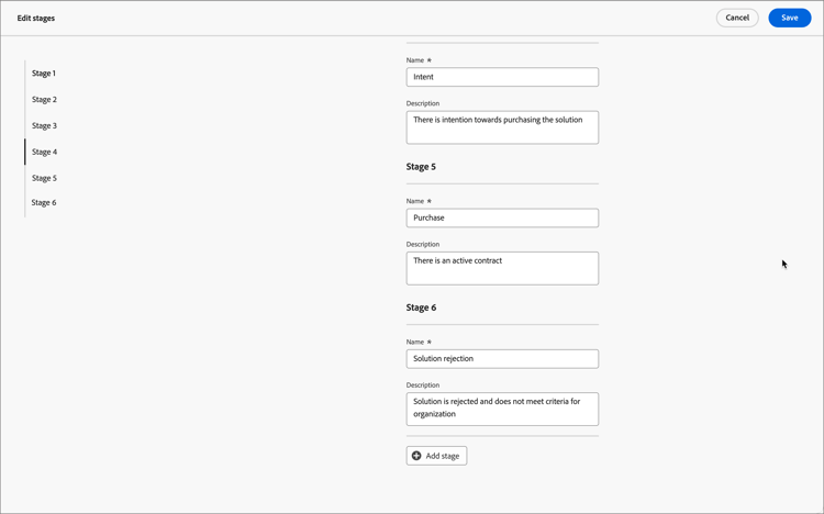 Na caixa de diálogo Editar estágios, você pode adicionar novos estágios ou alterar o nome e a descrição dos estágios existentes.