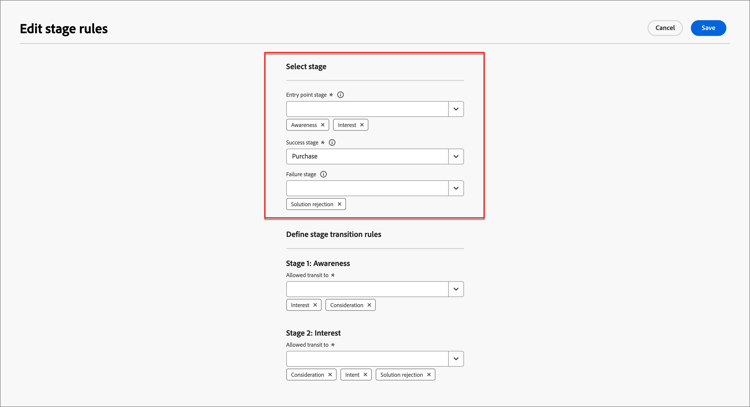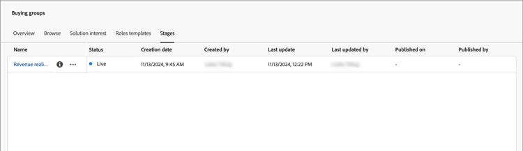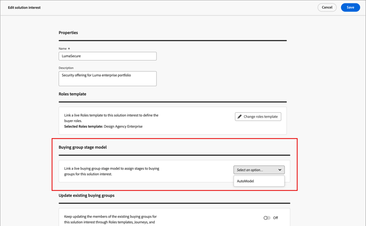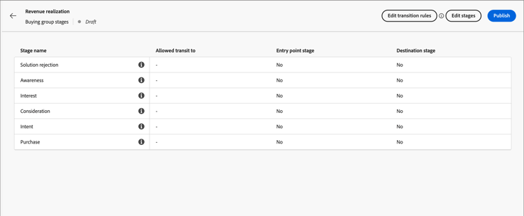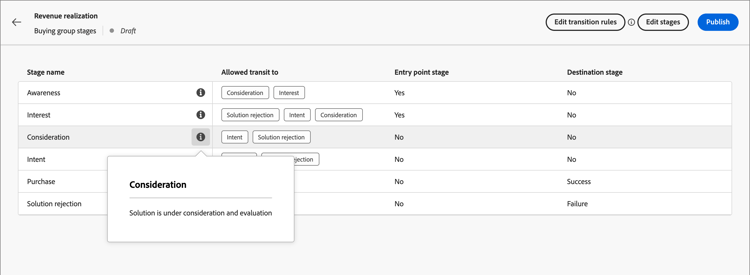 Quando o modelo de estágios de compra estiver em um status Live (publicado), adicione o modelo aos interesses de solução onde deseja usá-lo para rastrear a progressão do grupo de compras. Nas suas jornadas de conta, você pode incluir ações para fazer a transição de contas para um estágio especificado e adicionar transições de estágio como eventos que determinam como as contas se movem pela jornada.