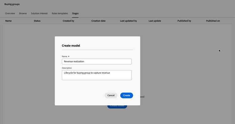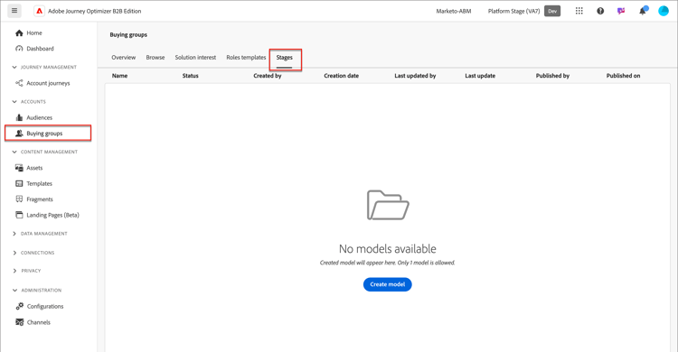 Há suporte para apenas um modelo, portanto, é importante trabalhar com as equipes de Marketing e Vendas para planejar o modelo ideal para a sua organização antes de criá-lo e publicá-lo no Journey Optimizer B2B edition.