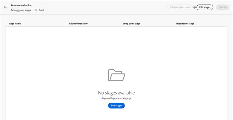 Desde que o modelo de estágios do grupo de compra permaneça em um estado de Rascunho, você pode editar os estágios e as regras de transição.