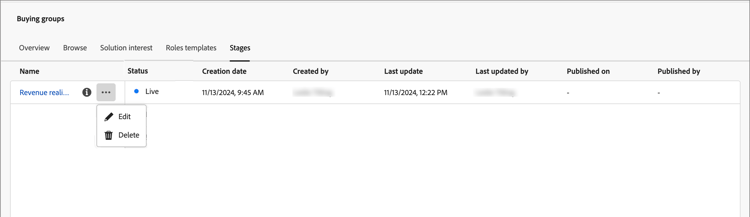 Você pode excluir o modelo de estágios do grupo de compra quando ele estiver em estado de rascunho ou publicado. Se for publicado (em tempo real), você poderá excluí-lo somente quando não estiver associado a um interesse de solução.