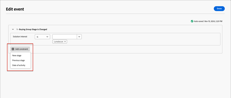 Clique em Adicionar restrição e selecione a alteração do estágio de grupo de compras que você deseja usar para acionar o evento.