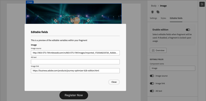 Por exemplo, se você criar um banner reutilizável que inclua um botão clicável, poderá designar o parâmetro de URL do botão como editável. Os autores de email podem usar um URL mais específico para a campanha de email. Com esses campos personalizáveis, os profissionais de marketing podem gerenciar e personalizar o conteúdo reutilizável sem a necessidade de criar blocos de conteúdo totalmente novos ou interromper as atualizações herdadas do fragmento original.