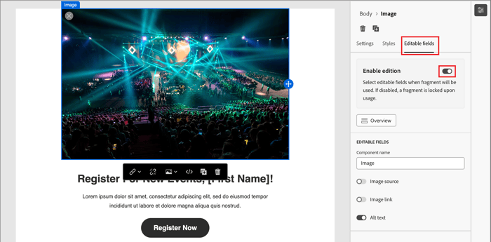 Quando um autor adiciona um fragmento a um modelo de email ou modelo de email, o conteúdo do fragmento é bloqueado por padrão. Quaisquer alterações no fragmento publicado são propagadas automaticamente para todos os ativos de conteúdo nos quais o fragmento é usado. Quando você designa um parâmetro para um componente no fragmento como editável, o autor do email ou modelo pode especificar um valor de campo personalizado específico para suas necessidades. Esse sinalizador de personalização é limitado aos componentes visuais de imagem, texto e botão.