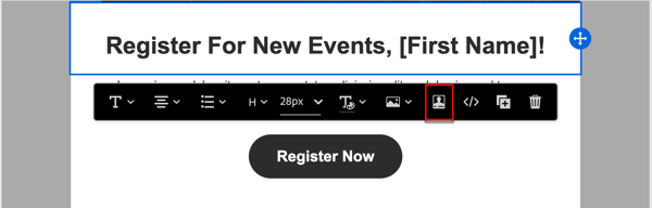 Selecione o componente de texto e clique no ícone Adicionar personalização na barra de ferramentas.