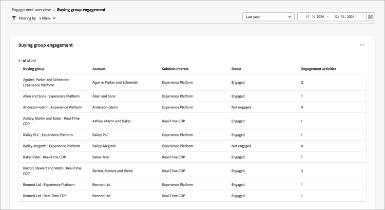 Os gráficos de círculo dividem contas, grupos de compras ou pessoas em categorias engajadas e não engajadas. A figura central exibe a contagem total em cada categoria, fornecendo uma compreensão rápida do envolvimento geral.