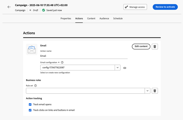 Use a guia Ações para selecionar uma configuração de canal para a sua mensagem e definir configurações adicionais, como rastreamento, experimento de conteúdo ou conteúdo multilíngue.