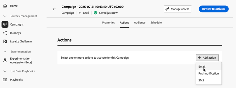 Use a guia Ações para selecionar uma configuração de canal para a sua mensagem e definir configurações adicionais, como rastreamento, experimento de conteúdo ou conteúdo multilíngue.