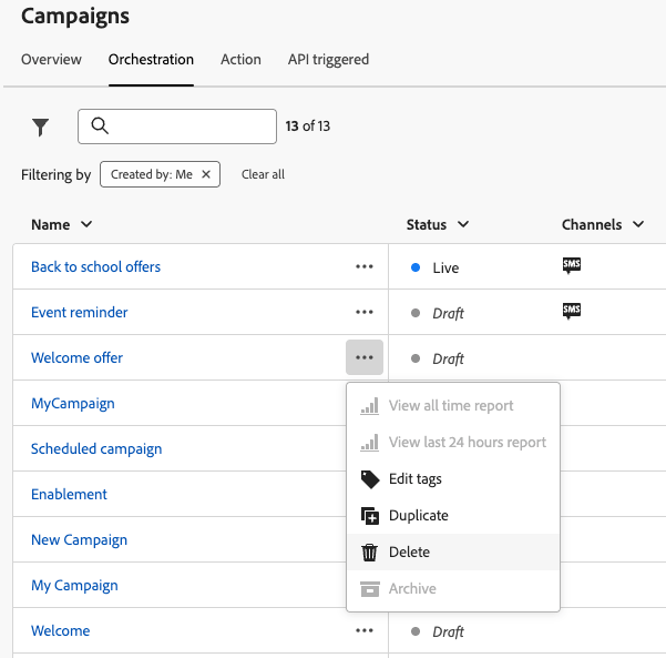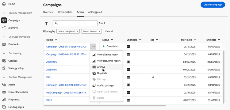 - Arquivar: arquive a campanha. Todas as campanhas arquivadas são excluídas em uma programação contínua 30 dias após sua última data modificada. Esta ação está disponível para todas as campanhas, exceto as campanhas de Rascunho. Saiba mais sobre arquivamento de campanha.