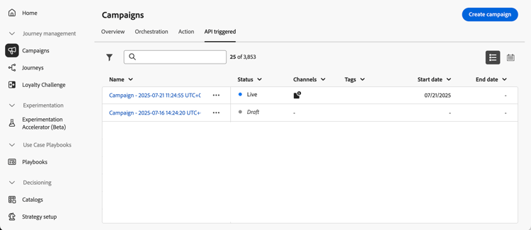 Selecione a guia API acionada para acessar a lista de campanhas acionadas por API.
