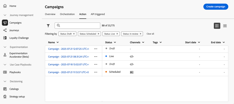 Selecione a guia Ação para acessar a lista de campanhas de Ação.