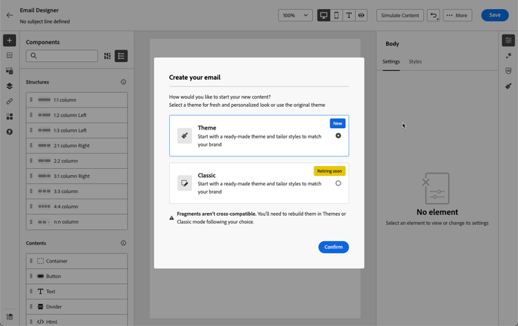 Para aproveitar totalmente todos os recursos do Designer de email, incluindo temas, você deve criar um novo conteúdo no modo Usar temas ou converter o conteúdo do HTML importado. Saiba mais