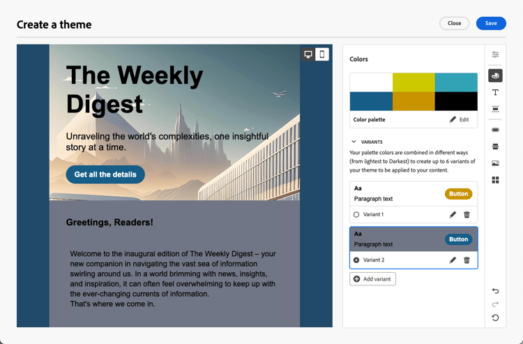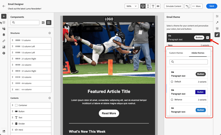 Clique fora da lista suspensa. O tema personalizado recém-selecionado aplica automaticamente seus estilos a todos os componentes de email. É possível alternar entre as duas variantes de cores.