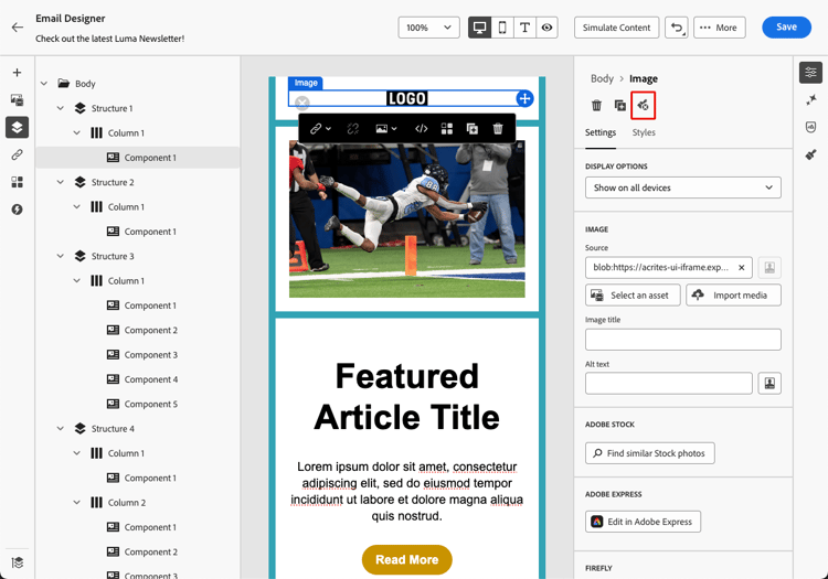 Esse recurso permite que os profissionais de marketing aproveitem emails visualmente atraentes e consistentes com a marca de forma mais rápida e com menos esforço, ao mesmo tempo em que fornece opções avançadas de personalização para necessidades de design exclusivas.