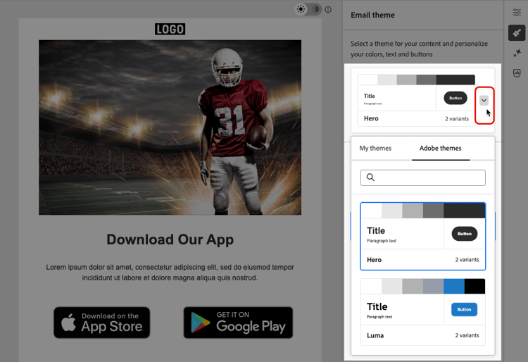 No Designer de Email, clique no botão Temas no painel direito. O tema padrão ou o tema do modelo é exibido. Você pode alternar entre as duas variantes de cor para esse tema.
