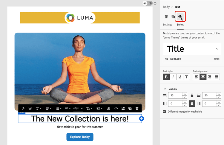 Clique fora da lista suspensa. O tema personalizado recém-selecionado aplica automaticamente seus estilos a todos os componentes de email. É possível alternar entre as variantes de cor, se houver.