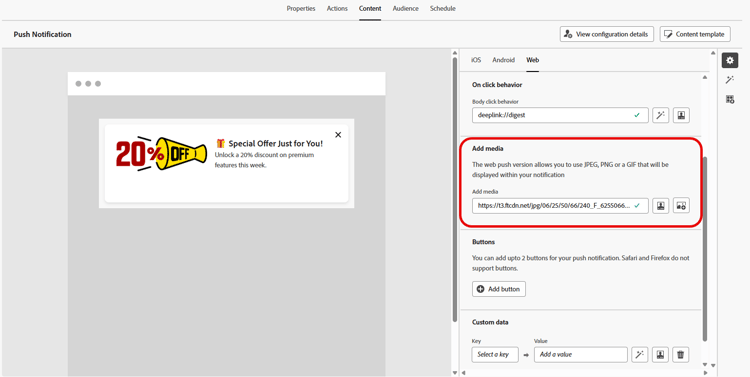 Insira a URL da mídia no campo Adicionar mídia. Você também pode incluir tokens de personalização no URL para personalizar o conteúdo de cada usuário.