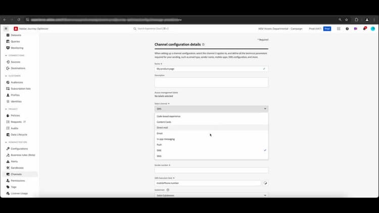 Com o Journey Optimizer, você pode definir configurações de canal (ou seja, predefinições de mensagem) que definem todos os parâmetros técnicos necessários para suas mensagens: tipo de email, email e nome do remetente, aplicativos móveis, configuração de SMS e muito mais.