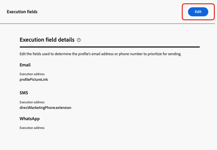 Nesse caso, Journey Optimizer usa Campos de execução para determinar qual endereço de email ou número de telefone usar do serviço de perfil em prioridade.