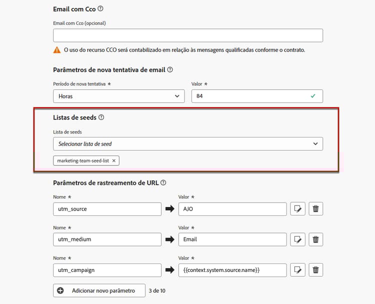 As listas de seeds em Journey Optimizer permitem que você inclua automaticamente seed addresses específicos em seus deliveries.