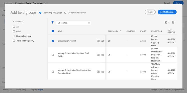 Para eventos gerados pelo sistema, o esquema deve incluir o grupo de campos Orchestration eventID. Journey Optimizer usa este campo para identificar eventos usados em jornadas.