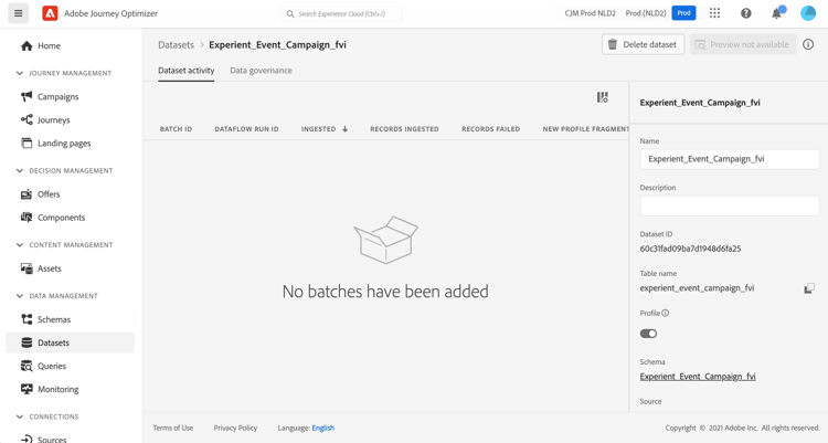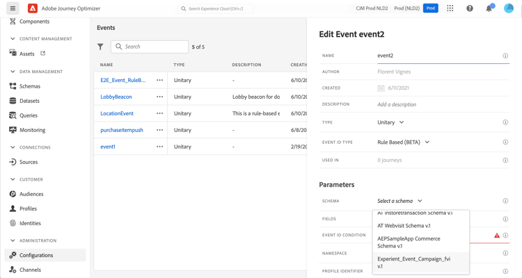A primeira etapa na configuração de um evento para Journey Optimizer é garantir que você tenha um esquema XDM definido para representar o evento e um conjunto de dados criado para registrar instâncias do evento no Adobe Experience Platform. Ter um conjunto de dados para seus eventos não é estritamente necessário, mas enviar os eventos para um conjunto de dados específico permitirá manter o histórico de eventos dos usuários para referência e análise futuras, sempre sendo uma boa ideia. Se você ainda não tiver um esquema e um conjunto de dados adequados para o seu evento, essas duas tarefas poderão ser feitas na interface da Web do Adobe Experience Platform.