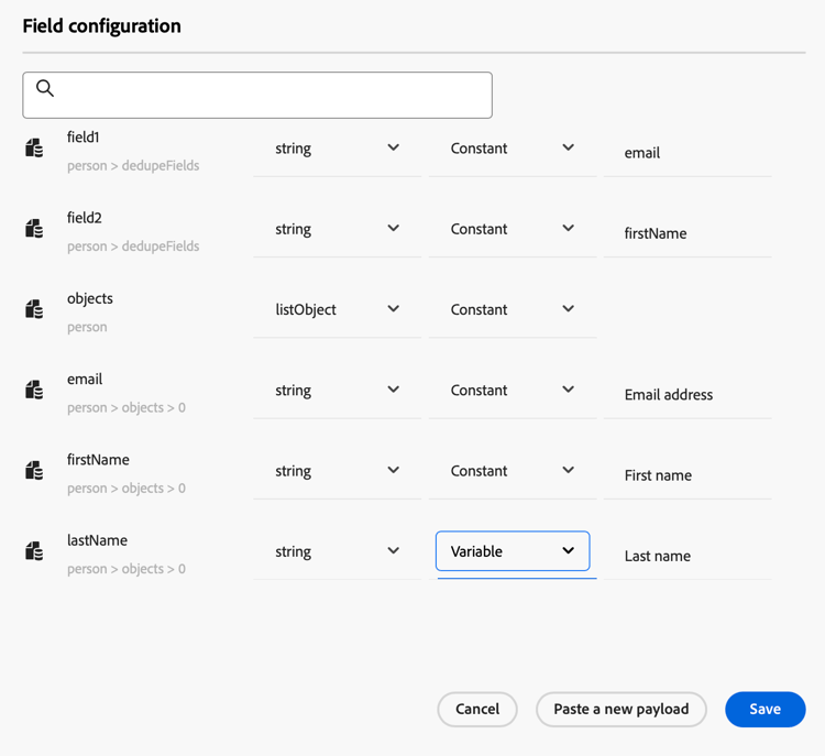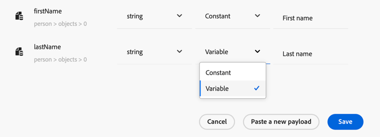 Observação: para passar valores dinamicamente, para cada campo, altere Constante para Variável.