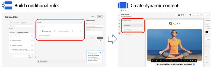 As regras condicionais podem ser aproveitadas no Email Designer e no editor de personalização para criar conteúdo dinâmico que se adapte aos perfis direcionados em suas mensagens.