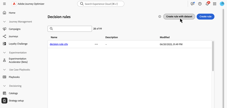 Vá para o menu Configuração de estratégia / Regras de decisão e selecione Criar regra com conjunto de dados.