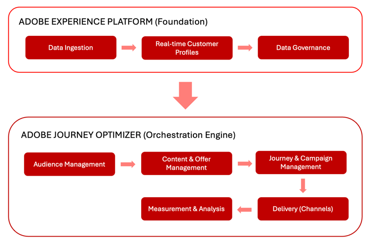 O Adobe Journey Optimizer (AJO) e o Adobe Experience Platform (AEP) trabalham juntos para permitir a personalização orientada por dados em escala. Esse ecossistema opera como um fluxo contínuo em que os dados são coletados, analisados e aplicados para criar jornadas personalizadas do cliente.