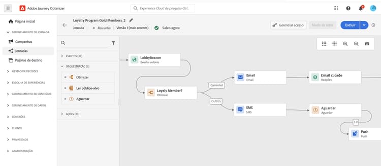 - Jornadas: engajamento individualizado em tempo real no qual cada cliente avança no seu próprio ritmo, acionado por comportamento ou eventos