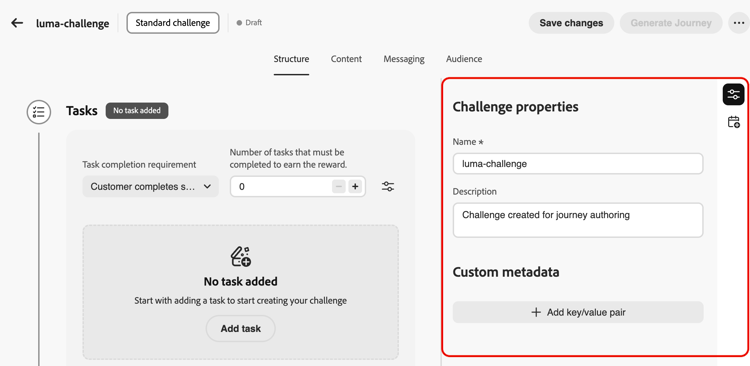 Na guia Estrutura, defina como seu desafio é organizado: suas propriedades, agendamento, tarefas a serem concluídas e recompensas a serem entregues.