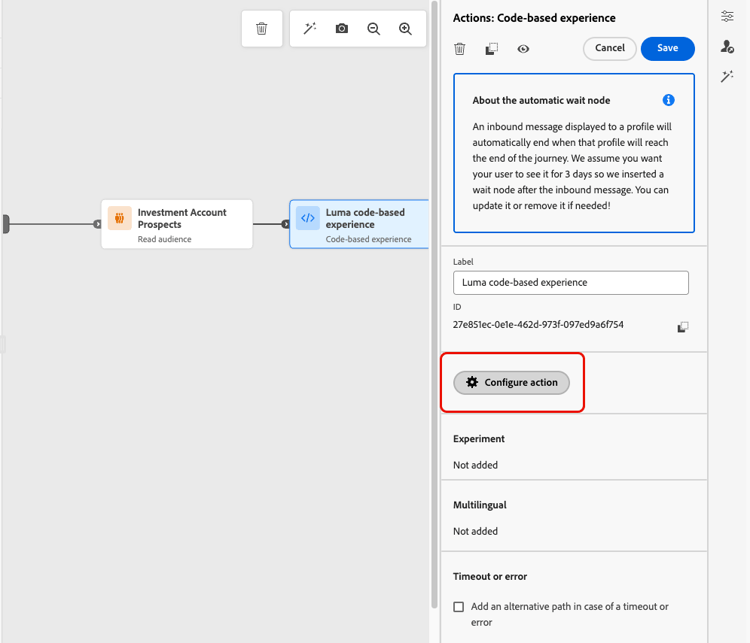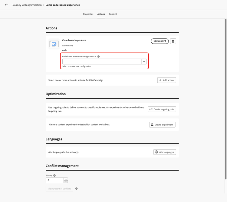 Você é direcionado para a guia Ações da tela de configuração da ação de jornada.