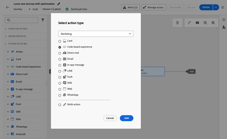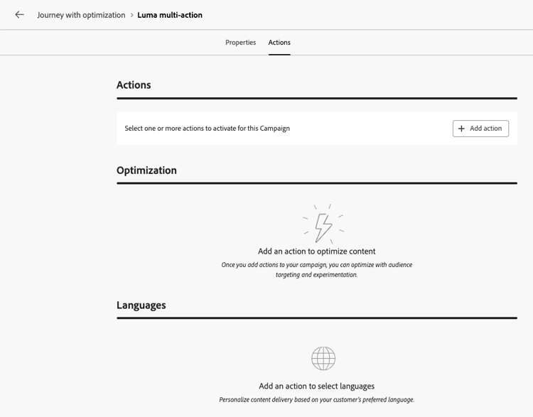 O Journey Optimizer vem com uma nova atividade genérica Action que permite configurar uma única ação de canal interna e também várias atividades de entrada.