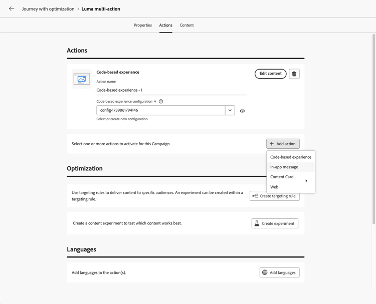 Selecione uma ação de entrada (Experiência baseada em código, Mensagem no aplicativo, Cartão de Conteúdo ou Web) na seção Ações.