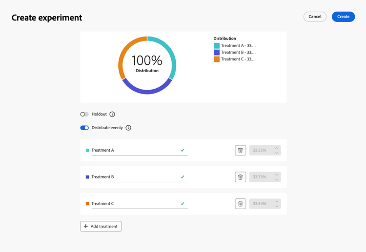 Você pode alocar uma porcentagem precisa para cada Tratamento ou simplesmente alternar na barra de alternância Distribuir uniformemente.