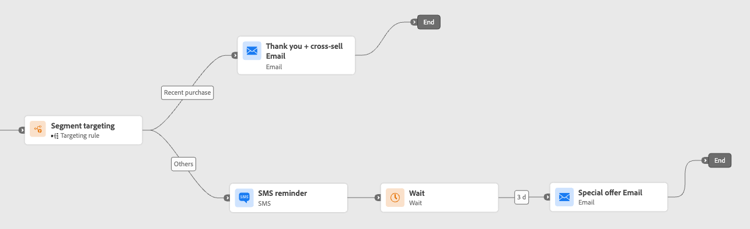 Os clientes que compraram recentemente podem entrar em um caminho curto de "Obrigado + Venda cruzada", enquanto aqueles sem histórico de compra entram em uma jornada de criação mais longa.