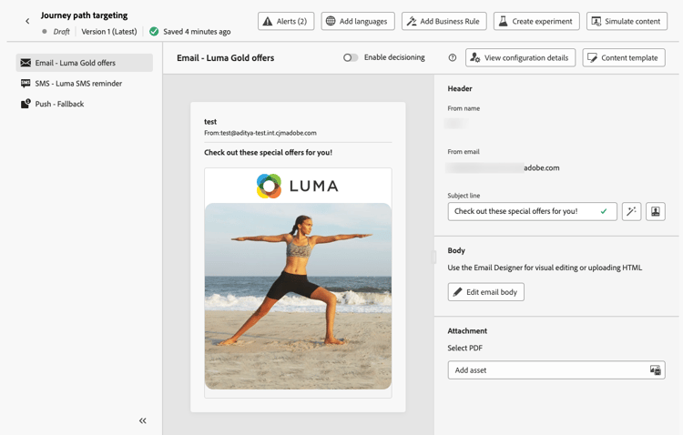 De volta à jornada, solte ações específicas para personalizar cada caminho. Por exemplo, crie um email com ofertas personalizadas para membros do Gold Loyalty e um lembrete SMS para todos os outros membros.
