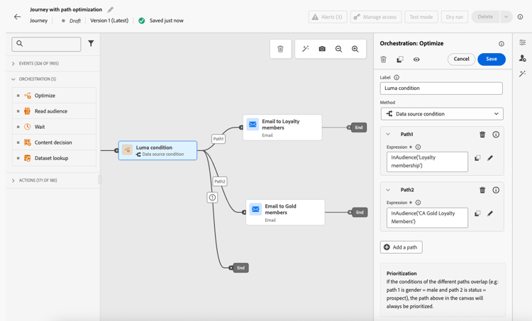 Na seção Orquestração, arraste e solte a atividade Otimizar na tela de jornada.