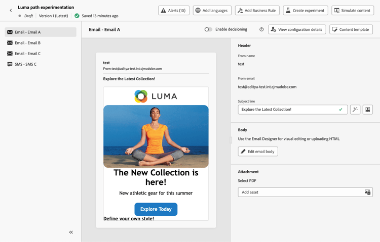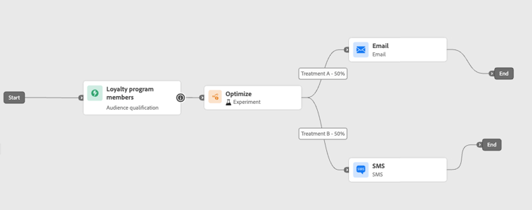 Quando a jornada estiver ativa, os usuários serão atribuídos aleatoriamente para percorrer caminhos diferentes. Journey Optimizer rastreia qual caminho tem melhor desempenho e fornece insights acionáveis.