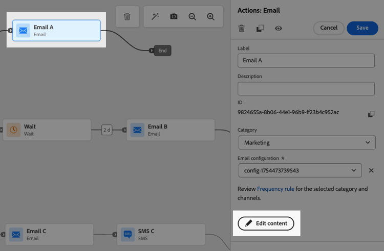 Selecione uma ação de canal e use o botão Editar conteúdo para acessar as ferramentas de design.