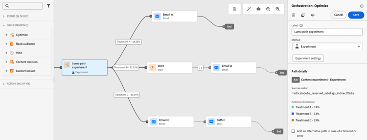 A atividade Otimizar permite definir como as pessoas avançam na sua jornada criando vários caminhos com base em critérios específicos, incluindo experimentação, direcionamento e condições específicas, garantindo o máximo de envolvimento e sucesso na criação de jornadas altamente personalizadas e eficazes.