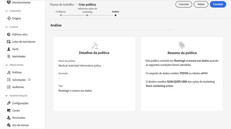 Depois que os rótulos e as ações de marketing forem definidos, você poderá criar políticas de governança de dados que vinculam esses dois elementos. Por exemplo, você pode configurar uma política que associe um rótulo “ePHI” a uma ação de marketing de “direcionamento por email”, garantindo que os campos rotulados como “ePHI” não sejam usados para personalizar mensagens de email. Saiba como criar políticas de governança de dados