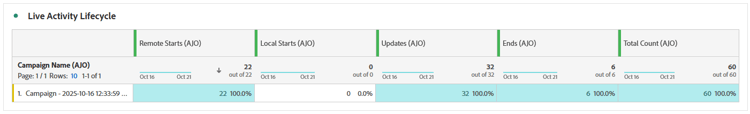 A tabela Ciclo de vida da atividade em tempo real oferece uma visão abrangente de como a atividade em tempo real progride. Ele oferece visibilidade sobre eventos importantes, como início, atualização ou término da atividade, ajudando você a entender melhor o engajamento do usuário e o ciclo de vida geral da campanha de atividades ao vivo.