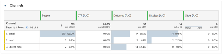 A tabela Canais fornece uma análise detalhada do envolvimento de seus perfis com suas mensagens no nível do canal. Isso permite que você obtenha insights mais profundos sobre o desempenho de diferentes canais.