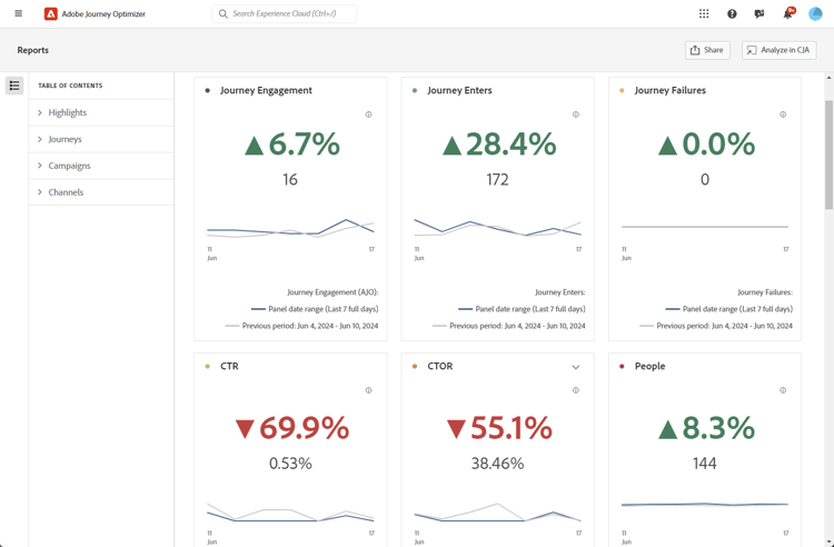 O relatório Visão geral oferece aos usuários um resumo completo das métricas de tráfego e engajamento para todas as campanhas e jornadas em seu ambiente. Essas métricas são combinadas para apresentar valores unificados para ações provenientes de diferentes canais, abrangendo várias campanhas e jornadas.