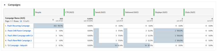 A tabela Campanha funciona como um painel abrangente, apresentando uma visão geral detalhada das métricas críticas para sua campanha. Ele apresenta dados essenciais, como o número de perfis e envios, fornecendo uma insight abrangente sobre os níveis de desempenho e engajamento da campanha.