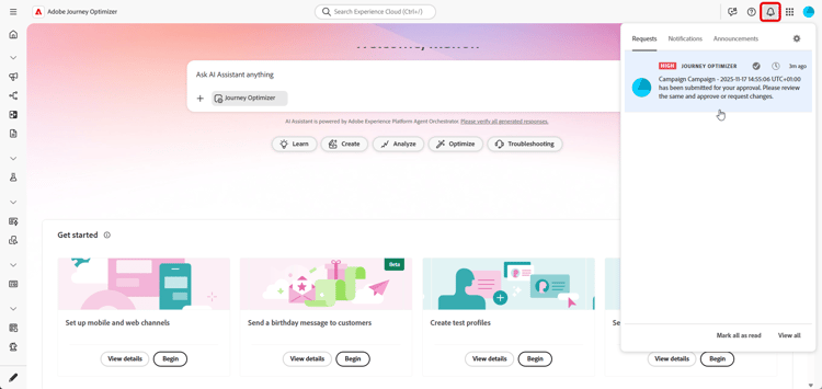 Se você tiver sido selecionado como aprovador, será notificado por meio de um email e um alerta do Journey Optimizer, que pode ser acessado ao clicar no ícone de sino na parte superior direita da tela, na guia Solicitações.
